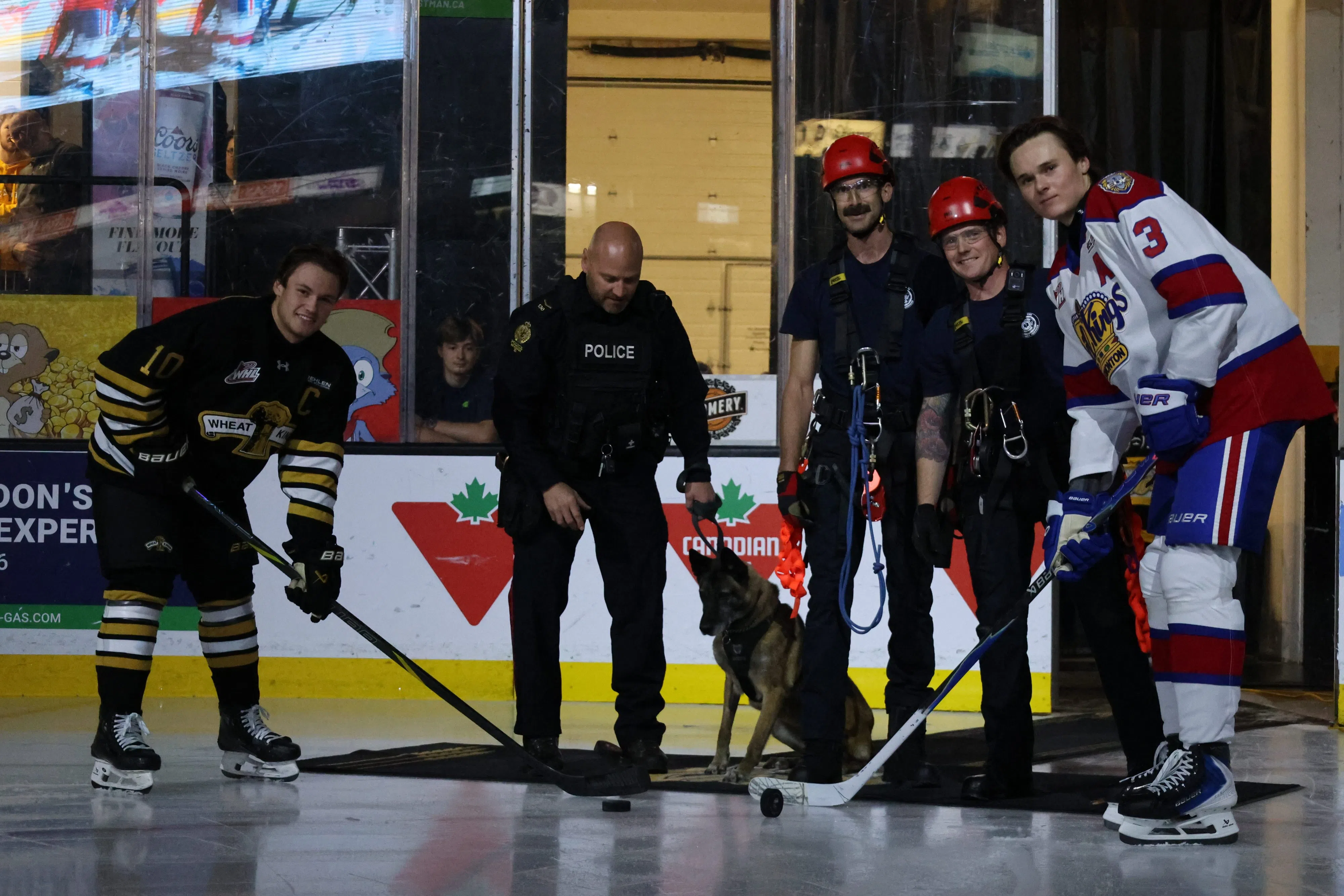 Caleb Hadland takes a ceremonial faceoff before the game against the Edmonton Oil Kings. (Photo by Jillybean Photography)