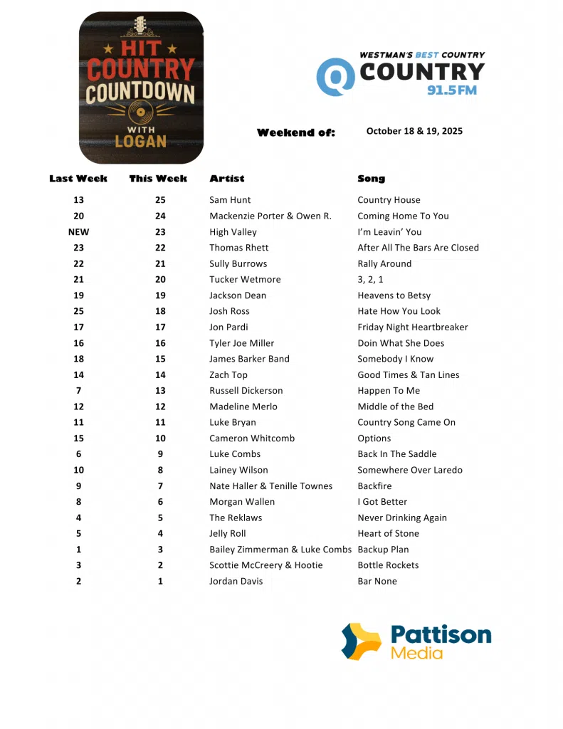 Hit Country Countdown Chart – October 18 & 19, 2025