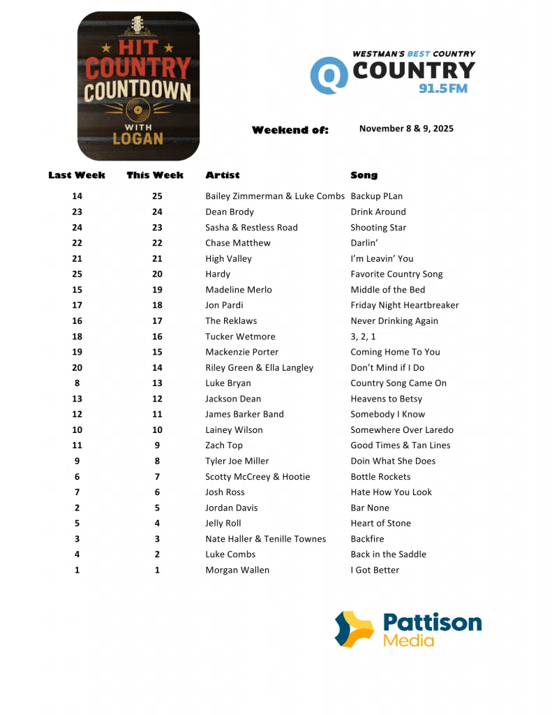 Hit Country Countdown Chart – November 8 & 9, 2025