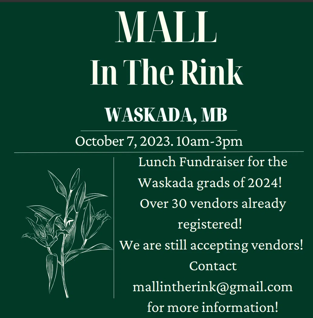 Visit Waskada on October 7th for Mall in the Rink! Vendors will be set up from 10am to 3pm at the Waskada arena. Admission is free!